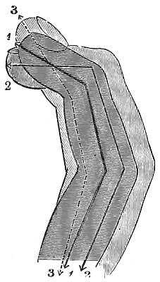 It has already been stated that a belly much injured by chrysals may be replaced by a new belly; any incurable failure of the back may also be cured by its renewal. A weak bow or limb may also be strengthened by these means. Also, if either limb be broken or irretrievably damaged, and the remaining one be sound, and worth the expense, another limb may be successfully grafted on to the old one. If possible, let this be an old limb also, as the combination of new and old wood is not always satisfactory; the former (though well seasoned,[25] being unseasoned by use), being more yielding, is apt after a little use to lose its relative strength, and so spoil the proper balance of the bow. This grafting of one broken limb upon another may be carried to the length of grafting together two limbs of different sorts. Mr. P. Muir, who was as good a bowyer as he was an accurate shot, had a favourite bow, that did him good service in 1865 at Clifton, when he took the third place at the Grand National Archery Meeting. This bow in one limb was yew-backed yew, and in the other lance backed with hickory. A bow that is weak in the centre, and not sufficiently strong to allow of the ends being further reduced, may be brought to the required shape, and strengthened by the addition of a short belly.