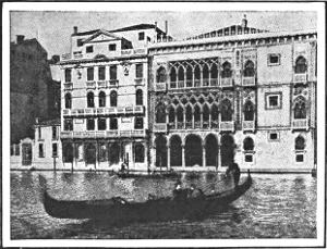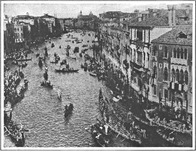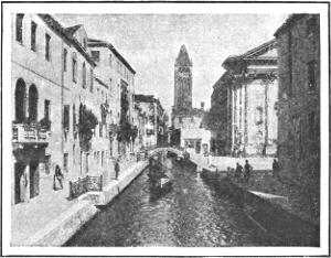It is trite and ineffective simply to say that the Grand Canal is the great artery and thoroughfare of Venice. It is so much more than that: it is a magnificent show course adorned with two hundred or more magnificent palaces dating from the fourteenth to the eighteenth centuries, and beautiful churches and interesting public buildings. A sightseeing trip in a gondola affords the visitor an object of architectural beauty and historic interest at every rod. The historic interest of some of these houses is double,—the interest attached to them by virtue of the original patrician owners, and a new interest acquired through the residence in them of notable men of later time. Drift slowly along this splendid waterway. Marble steps lead down from the noble residences to the water’s edge. Tall posts bearing the colors of the family serve as hitching posts for the boats. Your guide will tell you the stories, poetic and dramatic, of the families whose names are set down in the great roll of the nobility of Venice entitled “The Book of Gold.” Then you will be told of the later associations that enhance the interest of some of the palaces. That handsome mansion over there is where Desdemona lived. Nearby it is the Palazzo Vendramin-Calergi, (ven-drah´-min cahl-ehr´-gee) in which Richard Wagner (vahg´-ner) died in 1883. That stately palace over there was for a time the home of Robert Browning; he died there in 1889, and there is a memorial tablet on the wall. Look at those three palaces close together. The one in the center was occupied by Lord Byron in 1818. Nearby is the Browning home, a Gothic building, in which W. D. Howells wrote his “Venetian Life.” In another palace George Sand had residence for a time. The great painter Titian (tish´-an) lived in one of these buildings.
