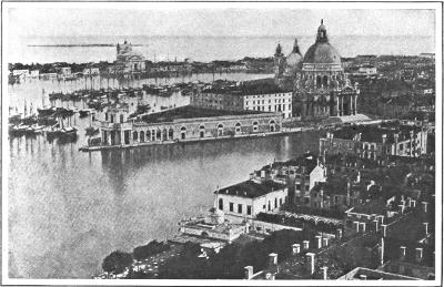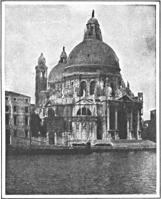 The Grand Canal, or Canalazzo, the street of the nobles in Venice, is one of the deeper channels in the lagoon. It is the original Rivo Alto, or deep stream, that created Venice, and up which the commerce of all countries was able to reach the city in the days of her splendor. Let us step into a gondola, and, telling our gondolier to keep to the left side till we reach the railway station, ascend the canal. That long, low building flanking the exact end of the canal, looking seaward, is the Dogana di Mare. It was erected in 1676 by Benoni. There on the summit are two Atlases bearing a gilded globe. A bronze Fortuna surmounts this, serving as a weather vane. And over there stands the Church of Santa Maria della Salute. During the plague of 1630 the republic vowed to give a church to Our Lady of Deliverance if the pestilence was removed, and the building was begun in 1631.