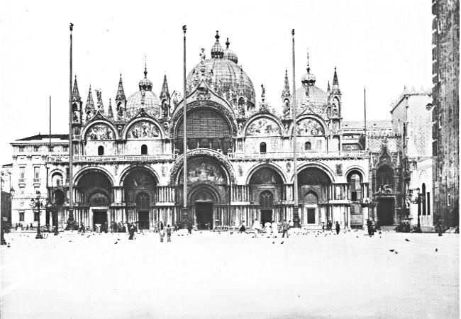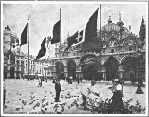 The view of Venice most familiar to stay-at-home bodies is the one to be had from across the water looking at St. Mark’s Place, and including, besides the cathedral of St. Mark, the Doge’s (doje) Palace and Campanile (cam-pa-nee´-le) Tower, and in some cases a glimpse of the Bridge of Sighs. The Piazza of St. Mark is called the “Heart of Venice.” All the life of the city surges there at certain times, then sweeps from there through its various channels. It is gayest on summer evenings, when the population turns out to enjoy the fresh air and listen to the military band. At that time the piazza is brilliant with fashionable people. Go there on a moonlight night, and you will find it a dream of beauty. You must see, of course, the pigeons of St. Mark’s. Flocks of them circle about the square or gather in groups on the pavement, wherever food is to be found. The pigeons of St. Mark’s used to be fed at public expense. It is not necessary now: there are always plenty of travelers that will pay them this pleasant toll for the sake of being photographed in their company. St. Mark’s Place is 191 yards in length, and in width 61 yards on one side and 90 on the other. The beautiful effect of it can hardly be expressed. It is paved with trachyte and marble, and surrounded by buildings that are not only important historically but most interesting architecturally.