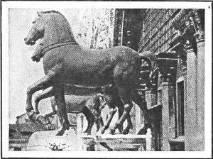 The building is in the form of a Greek cross, with mosaics covering more than 4,500 square feet. Over the upper entrance are four horses in gilded bronze, counted among the finest of ancient bronzes. They may have adorned the triumphal arch of Nero or that of Trajan in Rome. The Emperor Constantine sent them to Constantinople, and from there they were brought by the Doge Dandolo to Venice in 1204. These horses were taken to Paris by Napoleon in 1797, and for awhile crowned a triumphal arch in that city. After Napoleon’s downfall, in 1815, the bronzes were restored to their original place at Venice.