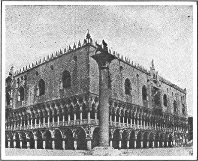 The nucleus of the first Venice, before it was made the seat of government of the republic, is said to have been the little district about the great bridge over the Grand Canal, which still retains the name Rialto. But as soon as the island group of Rivo Alto became the capital of the Venetian republic a palace for the Doge was erected near the open mouth, on the site that its successor still occupies. This earliest palace was probably built about the year 800. It was burned down in 976 and again in 1106. The present magnificent building was a slow growth over three centuries.