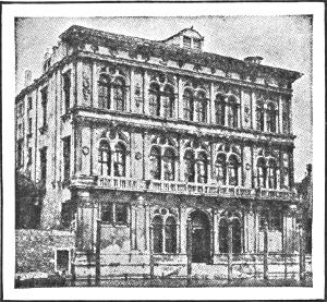 Here we are at the railway station. Now we turn and go down the other bank. We pass the broad mouth of the Cannaregio, and come to the gigantic Palazzo Vendramin-Calergi. Wagner, the great composer, died here. At the entrance to the Rio della Maddalena the canal makes an angle, and after passing many buildings and the mouth of the Rio di Noale we come to the Ca’ d’Oro. This is a very ornate building. Its name, the House of Gold, came from the fact that it was once gilded. Then we go by many palaces, and come to the Fondaco dei Tedeschi, or Guild of the German Merchants in Venice. An earlier Teutonic guild hall existed here from the thirteenth century. Venice imported oriental goods and passed them on to Germany. All the quarter round the Rialto Bridge was the business district, the Wall Street of Venice.
