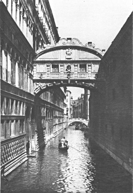 Aside from any sentimental reason, however, the Bridge of Sighs is most interesting architecturally. It was built in 1600. It is attractive in design, and it makes a good picture, connecting with fine lines the two grim buildings on each side and bridging over the long, narrow canal beneath.