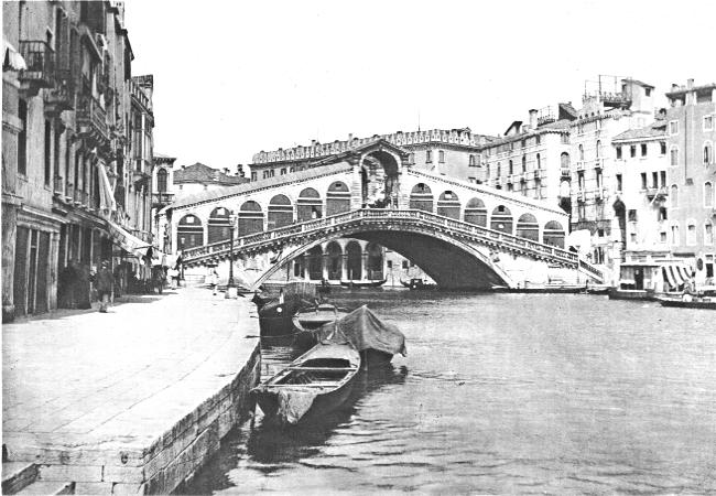For many years this was the only bridge across the Grand Canal, and it stands for much of the past glory of Venice. It is made of marble, and is over 150 feet long. It was built between the years 1588 and 1592, and is today, as it was in early times, a place of shops. Here Shylocks have bargained and Bassanios have met their friends these many years. More literally speaking, it was not the Bridge of the Rialto that Shylock refers to in Shakespeare’s “Merchant of Venice,” but the district nearby.