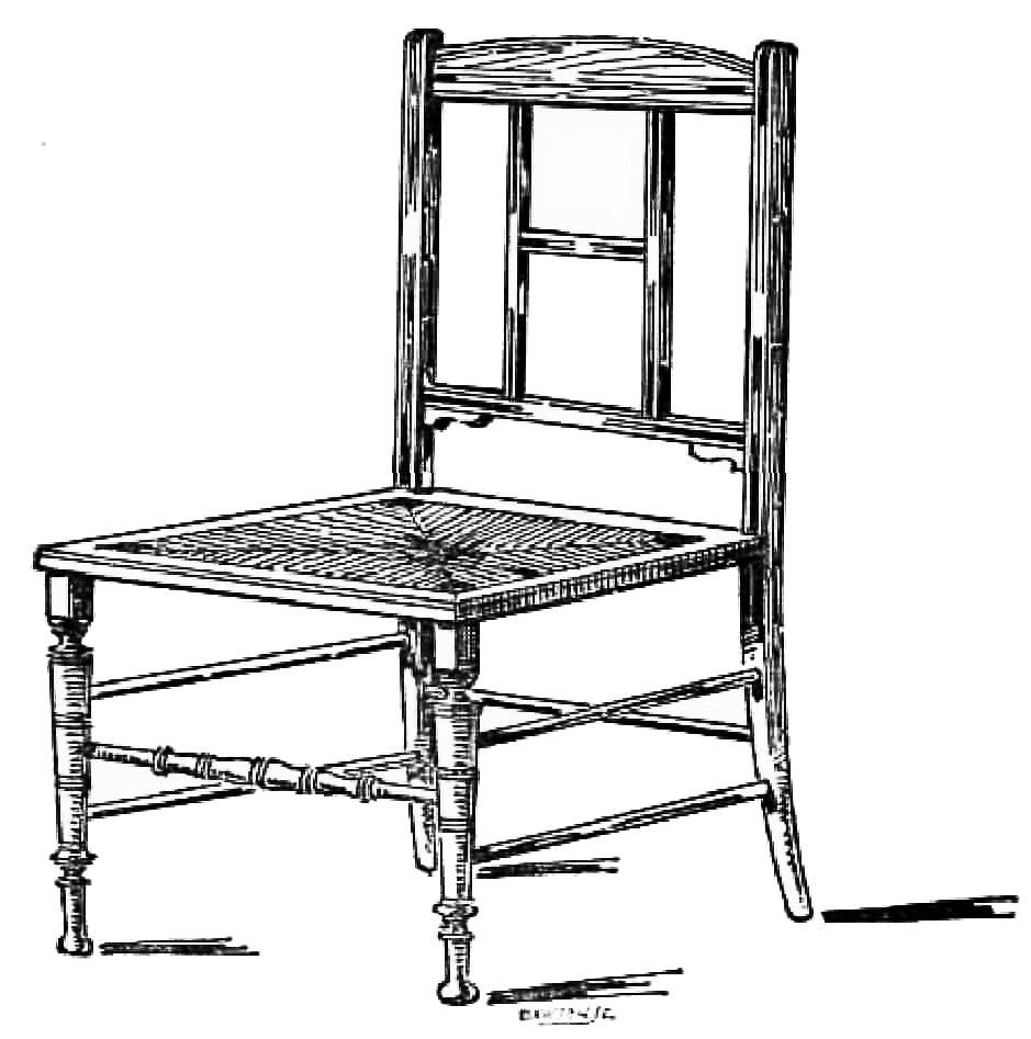 Do you recollect, I wonder, the orthodox dining-rooms of{8} twenty-five years ago?—the heavy, thick curtains of red or green cloth or moreen damask; the tremendous mahogany sideboard, generally with a cellarette underneath it, which, I recollect, made an admirable tomb in which to bury one’s dolls or obnoxious books, generally triumphantly taken from the schoolroom; the chairs that required two people to lift them; the carpet that seemed immovable, and that was too heavy to be shaken more than once a year; and the woolly-bear hearthrug that always smelt of dust, and that was a receptacle for all sorts of cinders, toy-bricks, leaden soldiers, and bones dragged in and buried there by a delinquent dog or cat? Why, the mere shaking of that rug once a week resulted in the discovery of all sorts of treasures that had been lost, and the dust that came out was enough to choke the neighbourhood, and doubtless would have done so had the other inhabitants not all been engaged with their own. Ah! if you do not all of you remember the dining-room of the past, I do; but never without a shudder, or a wonder how we managed to live in such a dark and dusty atmosphere, where work, reading, drawing, and writing all had to be hustled out of sight and out of the way of the parlour-maid, who came to ‘lay the cloth,’ and renew the foul odours, which had only just been exorcised, which breakfast had left behind it to poison the morning with. I should think that domestic furniture was at its very lowest depths of despair then; but that is thirty years ago, or perhaps forty, and nothing turned the tide for quite twenty years!
