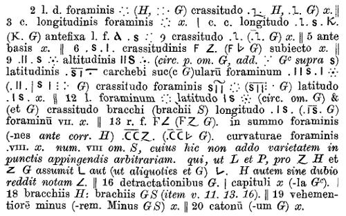 (Full text) epitoxitidos longitudo foraminis S‾, crassitudo ÷. item chelonii. cheles, sive manucula dicitur, longitudo foraminum trium, latitudo et crassitudo S÷ canalis fundi longitudo foraminum XVI, crassitudo foraminis , altitudo S÷. columellae basis in solo foraminum VIII, latitudo in plinthide, in qua statuitur columella, foraminis S.̅.̅, crassitudo FZ, columellae longitudo ad cardinem foraminum XII, latitudo foraminis S÷, crassitudo CC9. eius capreoli tres, quorum longitudo foraminum VIIII, latitudo dimidii foraminis, crassitudo Z. cardinis longitudo foraminis, columellae capitis longitudo ISK.