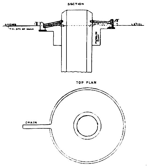 In paths or gullies a small concrete saucer drain can be constructed, at a cost not exceeding four annas a lineal foot, into which the house connections can be made,—the paths being paved with bricks, set flat, not costing more than Rs. 2–8 per 100 square feet. These should be laid at a good slope to the drain, and as only foot traffic need be provided for, is amply strong enough. In many cases it will be found that adjacent house-holders are quite willing to pay for this work, when once a commencement is made, and the advantage is obvious to them.