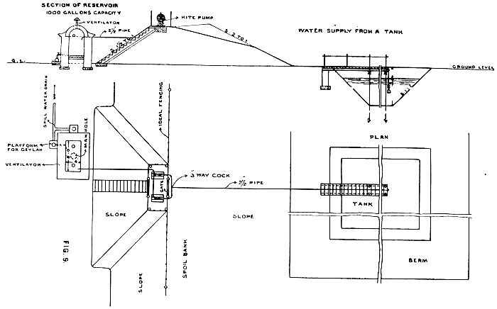 14Where tanks are used as a source of drinking water-supply, they should be properly fenced and conserved, and the water drawn by a pump. Recent researches have proved that polluted water, if stored in a tank or reservoir where it can be preserved from subsequent contamination, rapidly becomes pure. The Type plan, approved by the Sanitary Board of Behar and Orissa, is shown in Fig. 9, page 13. This for an existing tank of 100 yards square area is estimated to cost Rs. 2,700. The pumps, provided in duplicate, are Kite double action pattern and cost about Rs. 425 each. The fencing provided is the Ideal Woven wire fence, 10 strands, 48″ high, and can be fixed at about 12 annas per yard.
