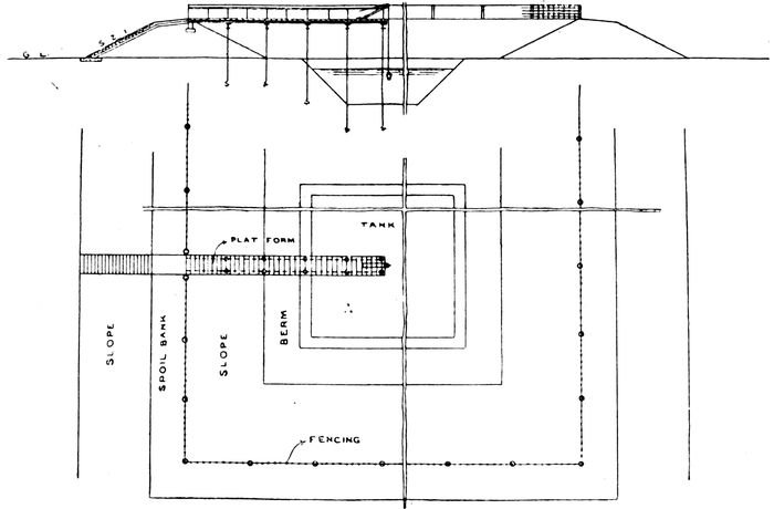 163. The spoil from the excavations should be placed on the outside of the embankment formed round the tank when originally made, and should be deposited in such a position to preclude, as far as possible, its being washed back again by rain water.