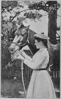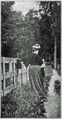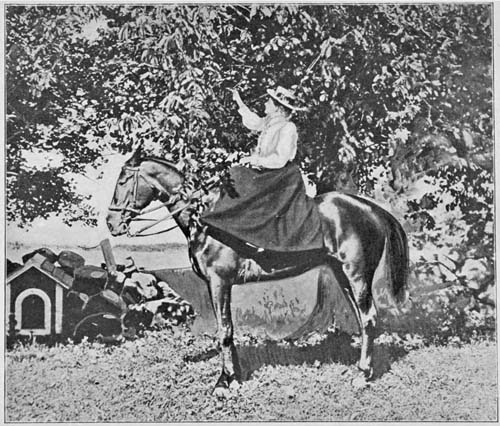 Miss Letty did not answer though she was afraid he would hear her heart beat it was thumping so loudly, but looking about with a swift glance spied Tommy’s gun that had fallen unnoticed in the grass. Seizing it, she slipped it between the two furthest apart wires, managing to catch a barb in the muzzle, and pried, while with the handle of her riding crop she pulled back the two loose strands with all her strength. There was a sound of tearing cloth, a pocket burst open, throwing its contents in among the leaves, and Mr. Hugh crawled out on his hands and knees, literally at Miss Letty’s feet. Just as she stretched out her hand to help him, lest he slip backward, one of the papers that Tommy was cramming back into the letter-case caught her eye; it was the picture of herself that Anne had taken, and which had disappeared as if[392] by magic. Mr. Hugh, if it was possible, turned redder than he was before he was released; but Letty, with quiet tact, quickly unfastened Brown Kate and, scrambling into the saddle by the aid of a stone at the fence corner, cantered off in the opposite direction to where Mr. Hugh’s horse was now quietly grazing.