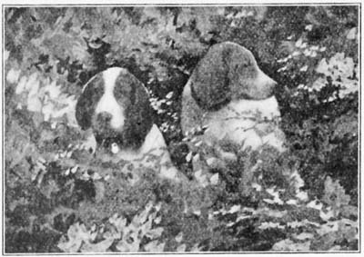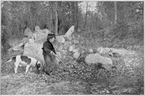 Tommy found his way back to the path, and met Waddles hurrying along; he also had found poor hunting, and was now willing to follow. After walking some distance, and having several[384] false alarms (for when on the watch a couple of beech leaves or a tuft of wild grass take fanciful shapes), Tommy actually saw a pair of long ears held erect, and a pair of bright eyes glistening around the corner of a rock just before him. His first fear was that Waddles should see the prize and chase it away before he had a chance to aim and cock his trigger, which was quite a feat, the spring was so strong. For once, Waddles neither scented nor suspected anything, but kept close to Tommy’s heels, nosing about in the moss.