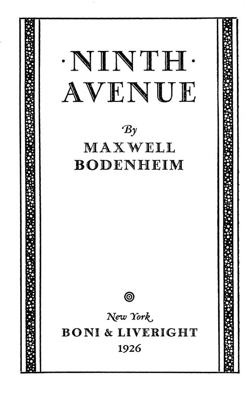 When the light of morning touches the buildings and pavements of a city, it always seems to borrow their hardness and to lose in some degree its quality of flowing detachment. The Sunday morning that fell upon Ninth Avenue, New York City, gave you a sense of invisible stiffness in its very air. The buildings, with their smudged, flat fronts and tops, presented the impression of huge warehouses stretching down both sides of the street—the appearance of holding commodities rather than human beings. Most of them were five or six stories in height, and their curtained, oblong windows and the bright, tawdry shops at their base had an oddly lifeless aspect, in spite of the sounds and animations which occurred within and around them. The iron elevated-railroad structure that extended down the street, with all of its roar and rush of trains, could not destroy the spirit of silent inertia that lurked within the scene.