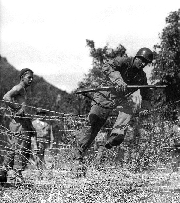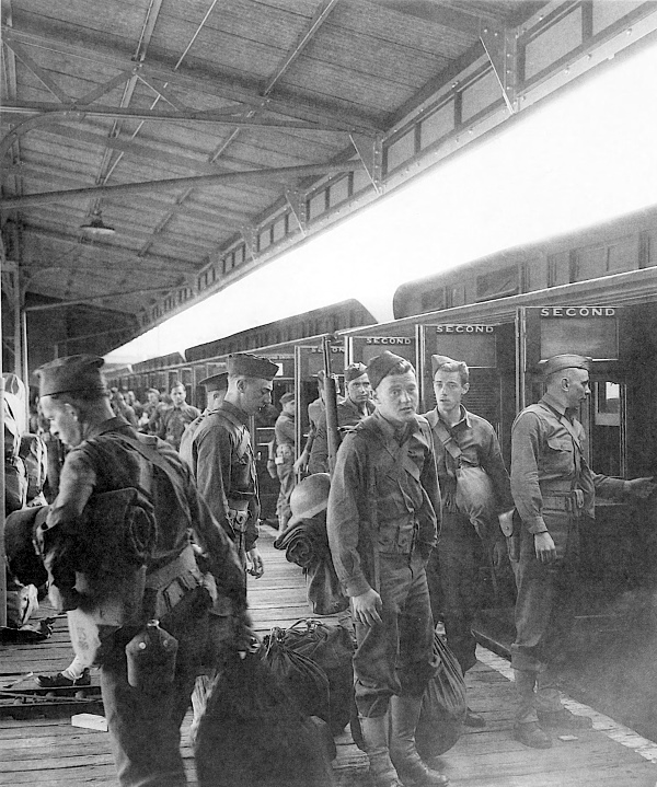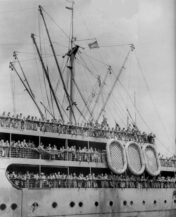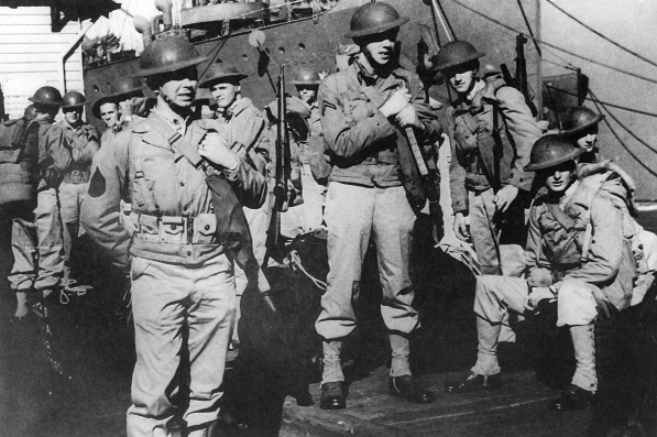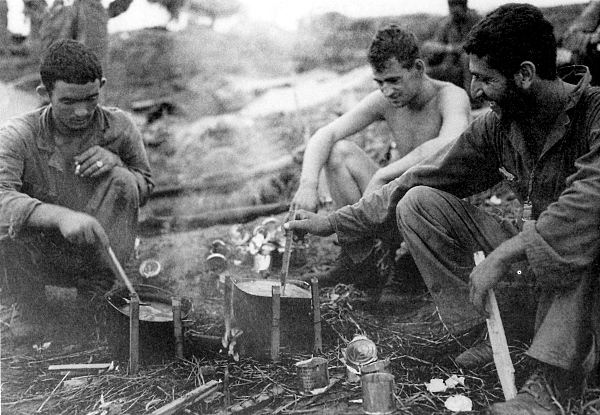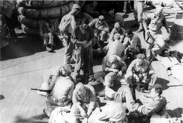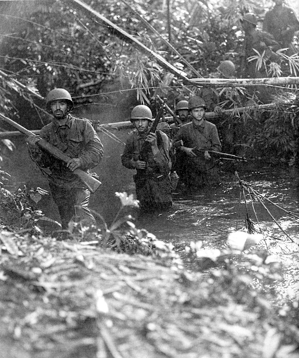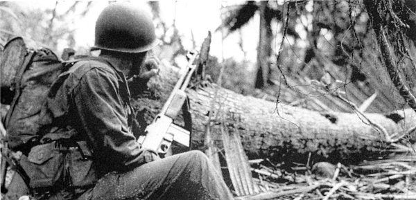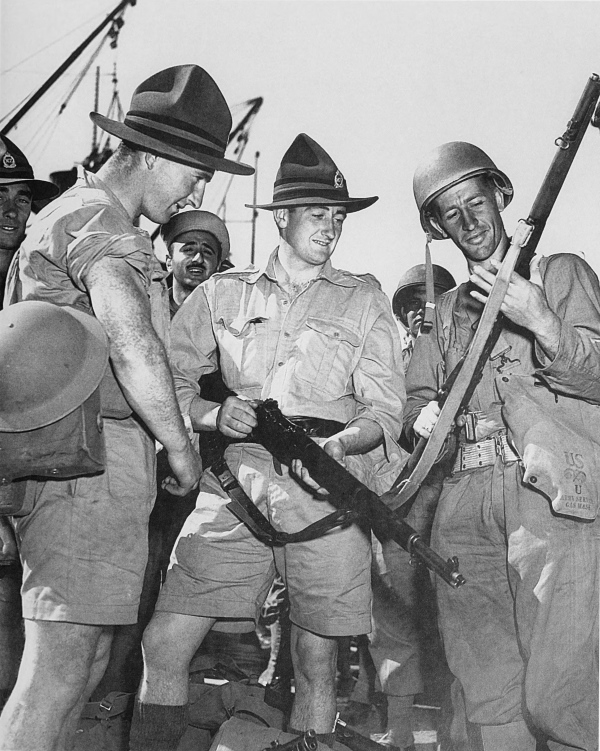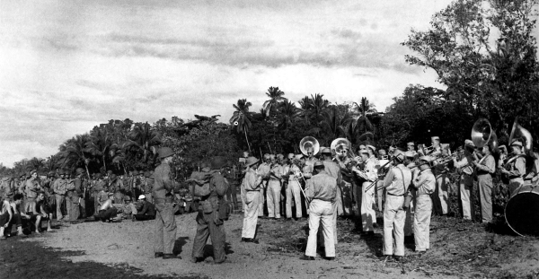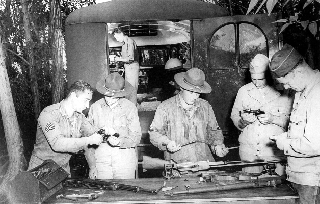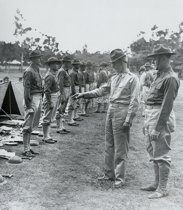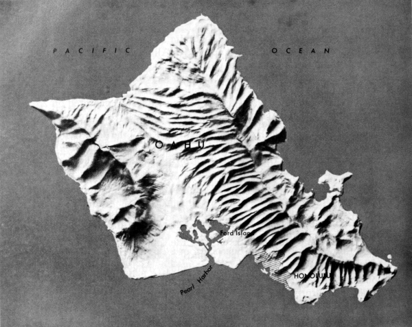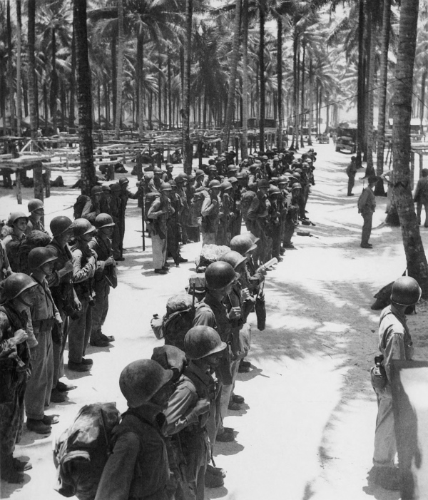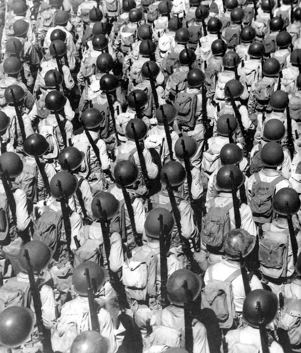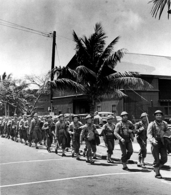 INFANTRYMEN DURING A FIELD INSPECTION in the Hawaiian Islands, January 1941. From 1935 on the U.S. garrison in the Hawaiian Islands was larger than any other American overseas outpost. However, by 1940 there was a shortage of modern equipment and trained personnel, and not until February 1941 did troop reinforcements and up-to-date equipment begin to arrive in Hawaii. The United States was not prepared for war and the men and equipment did not meet the necessary requirements.