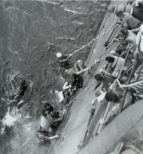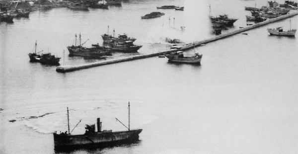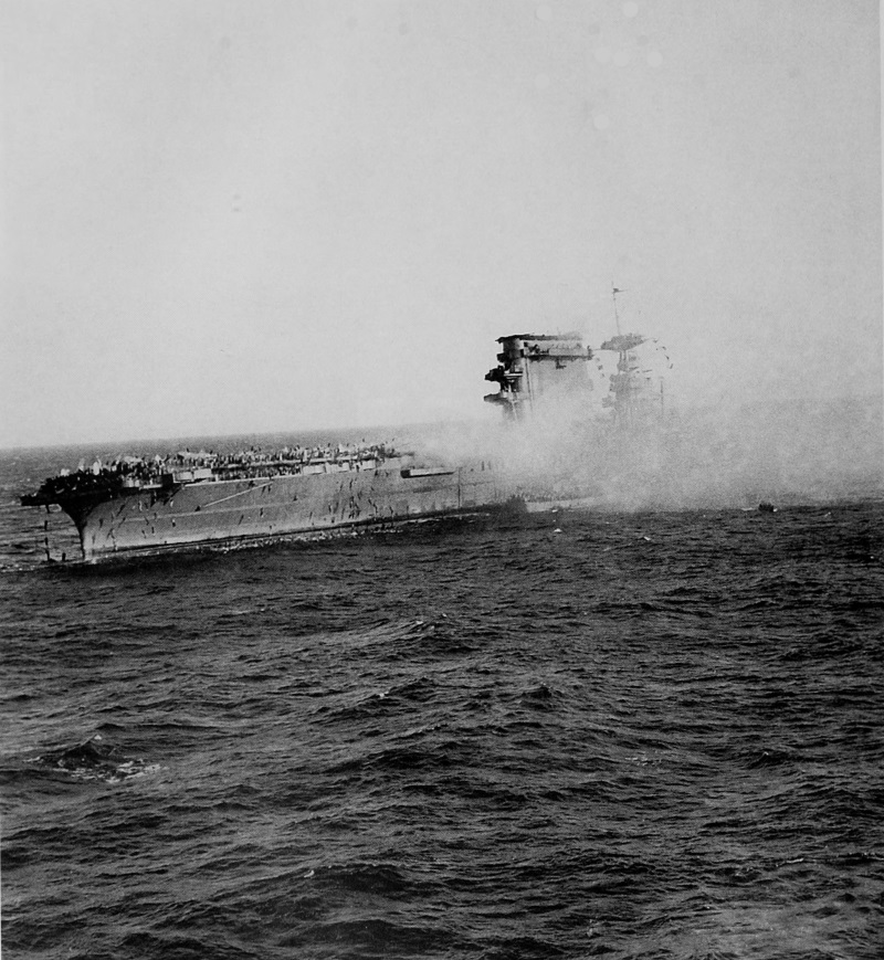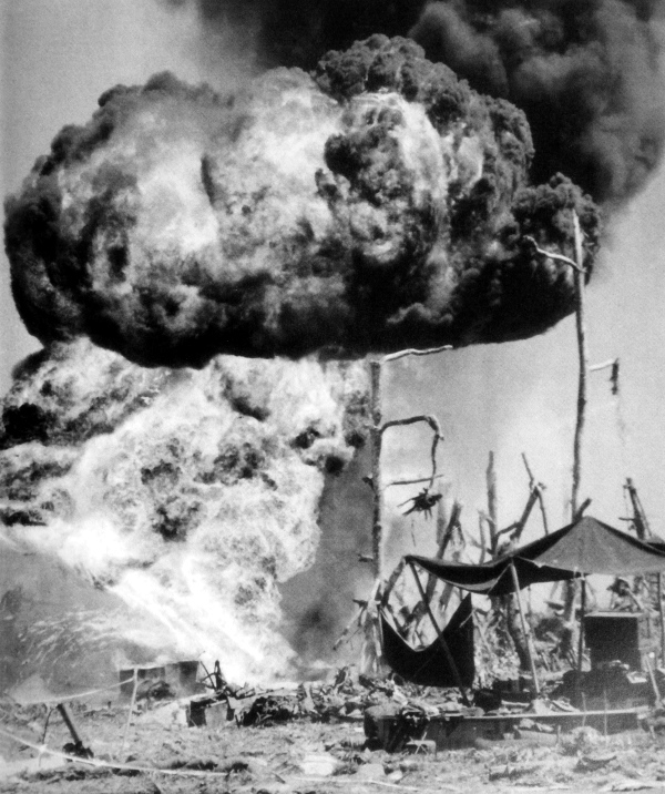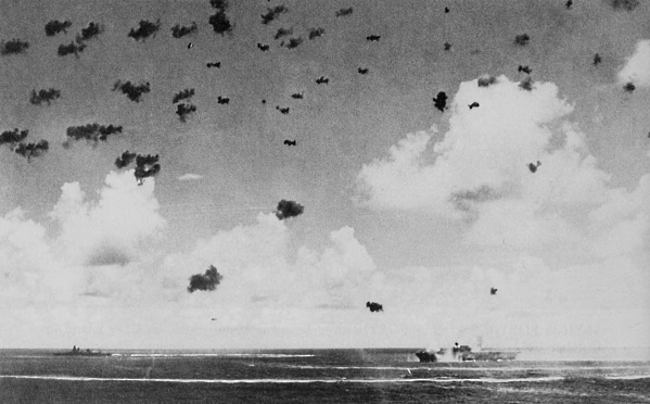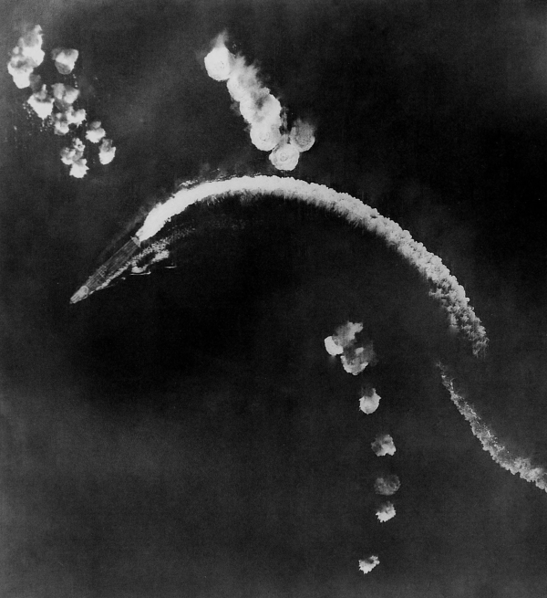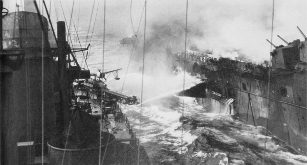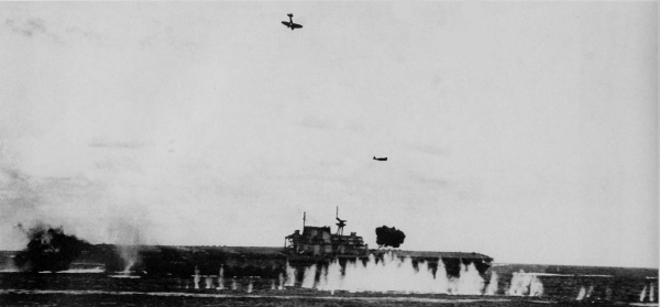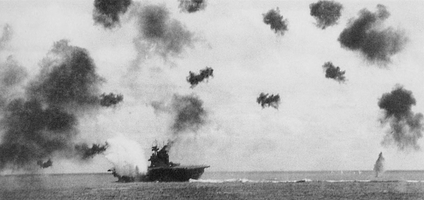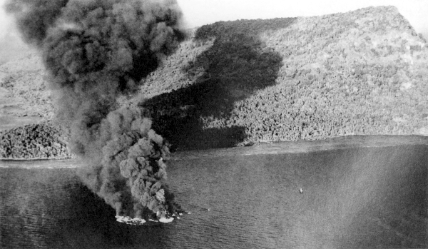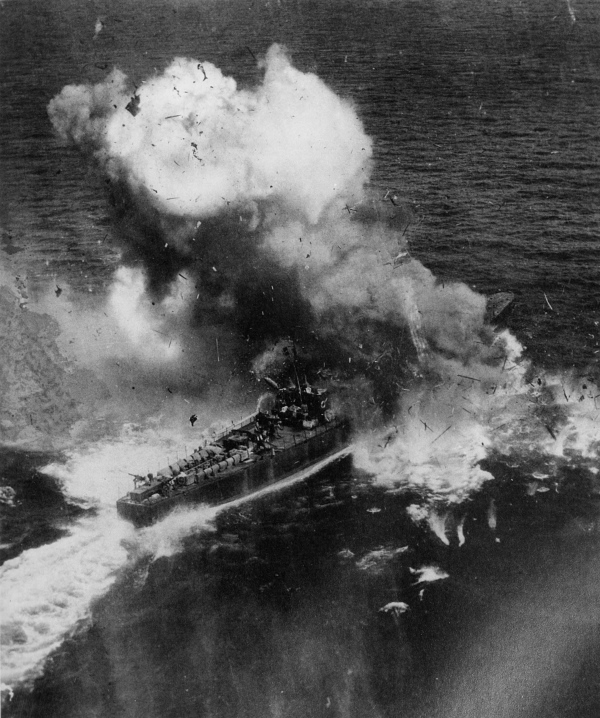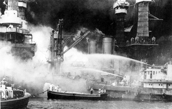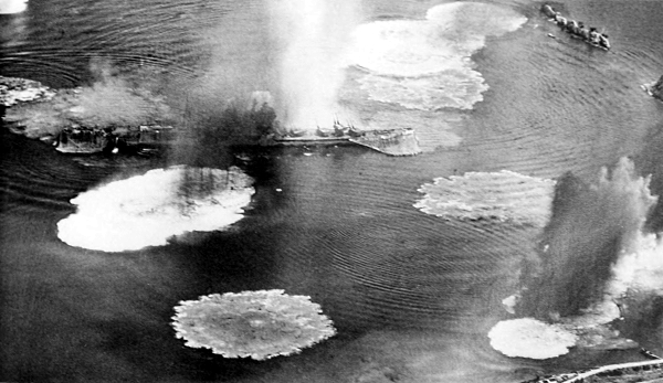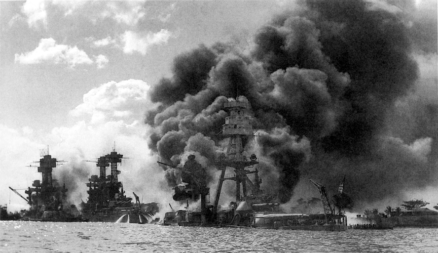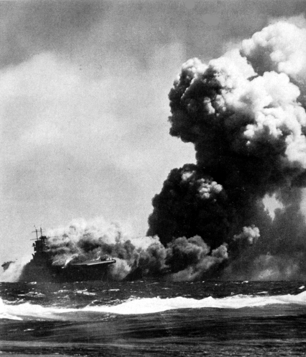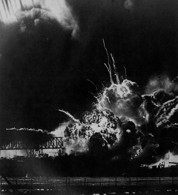 THE DESTROYER USS SHAW EXPLODING during the attack on Pearl Harbor, 7 December. The first attack on the U.S. warships anchored in the harbor was delivered at 0758. By 0945 all the Japanese aircraft had left Oahu and returned to their carriers. The U.S. Pacific Fleet suffered a major disaster during the attack which lasted one hour and fifty minutes. Sunk or damaged during the attack were the destroyers Shaw, Cassin, and Dowries; the mine layer Oglala; the target ship Utah; and a large floating drydock. Also hit were the light cruisers Helena, Honolulu, and Raleigh; the seaplane tender Curtis; and the repair ship Vestal.
