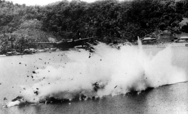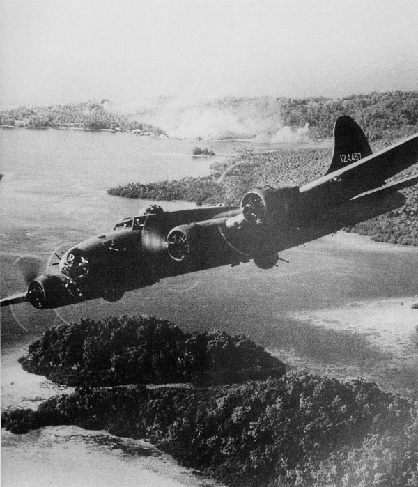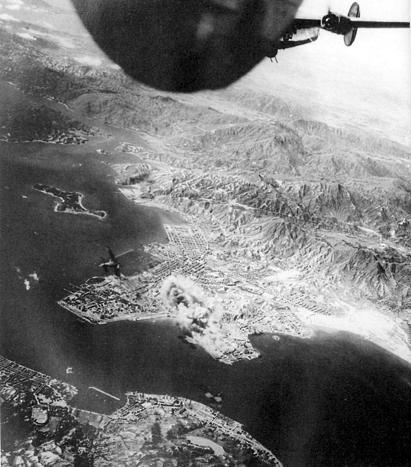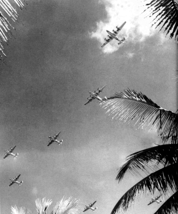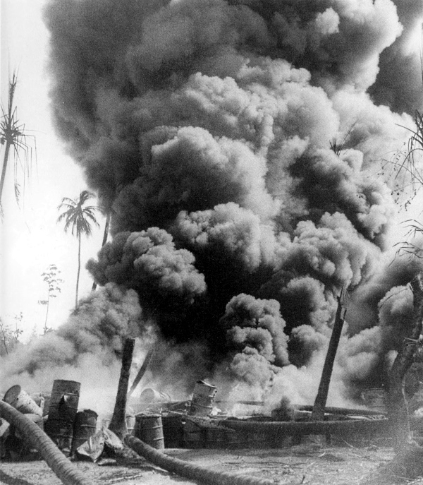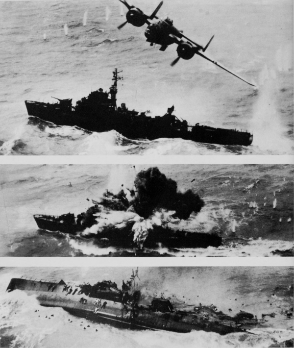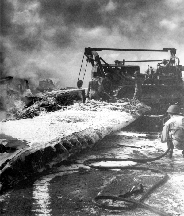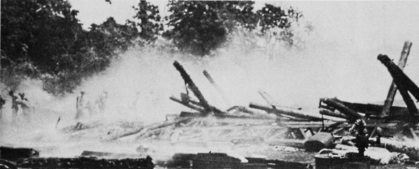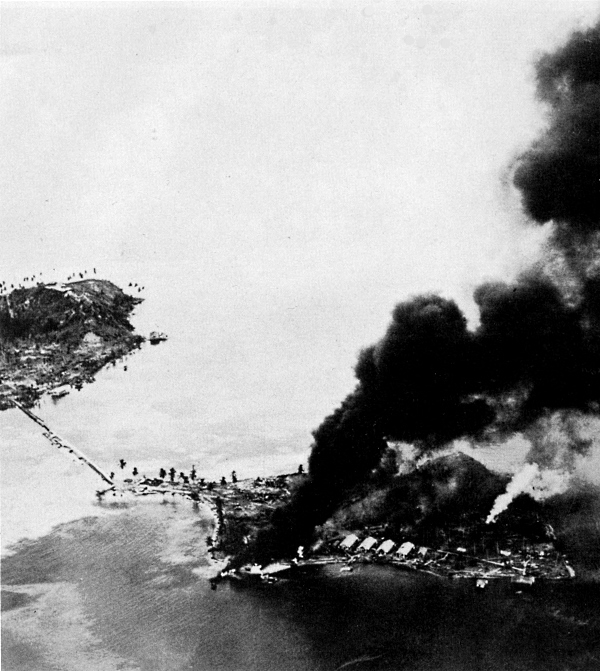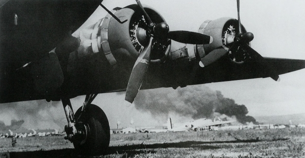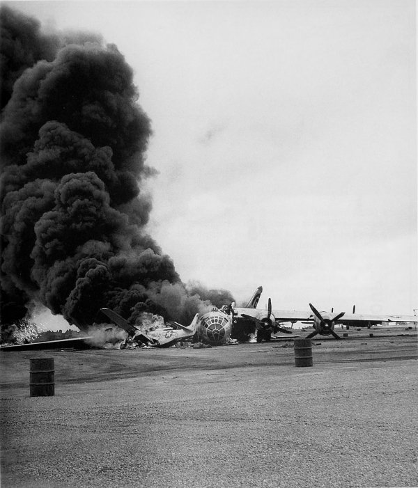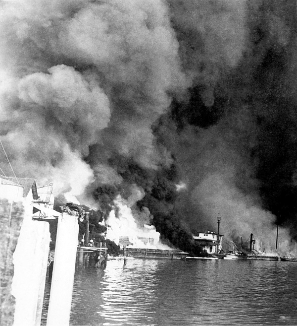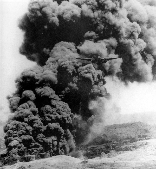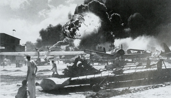 FLYING FORTRESSES, Boeing B 17C heavy bombers, burning at Hickam Field, Oahu, on 7 December 1941 (top); wreckage at the Naval Air Station at Pearl Harbor, after the enemy attack, 7 December (bottom). At 0730 on 7 December the first waves of Japanese aircraft struck the U.S. defenses. Although a few U.S. fighter planes managed to get into the air and destroyed some of the Japanese planes, the attack wrought severe damage. After neutralizing the airfields the Japanese struck at the U.S. Navy warships in the harbor.