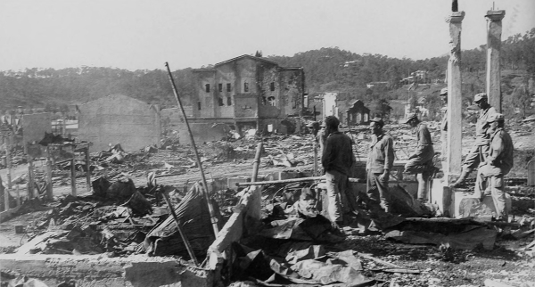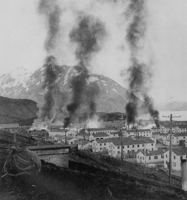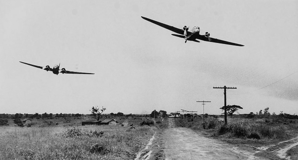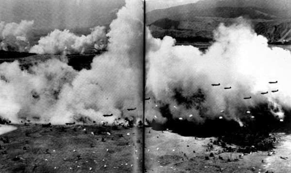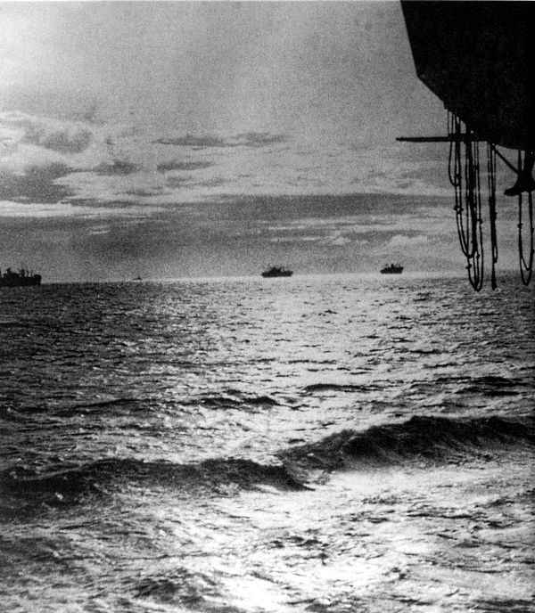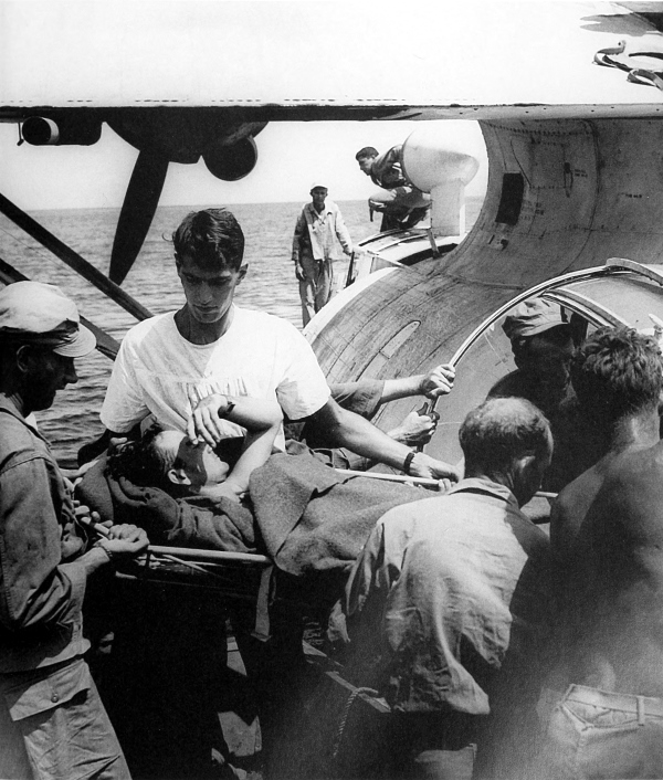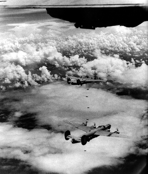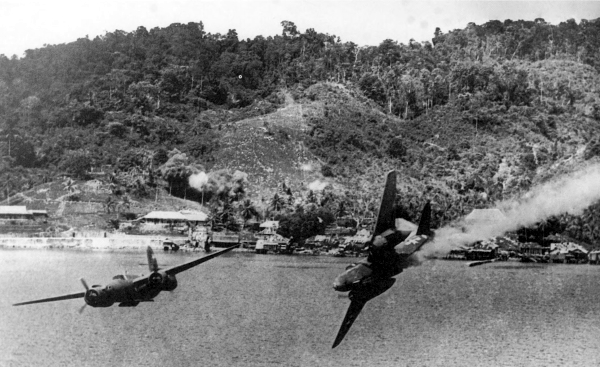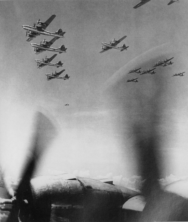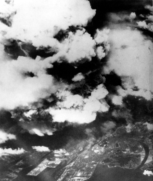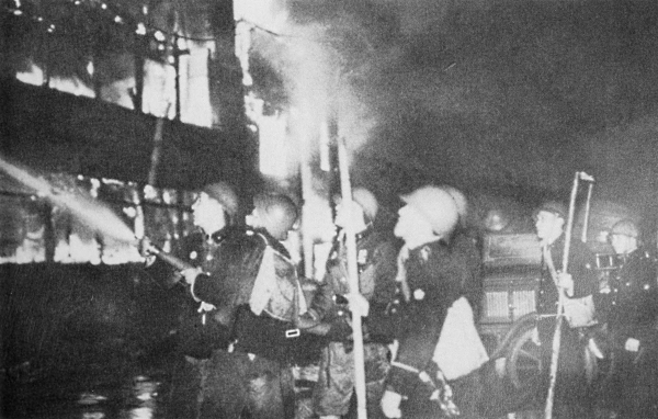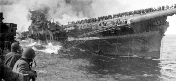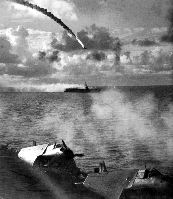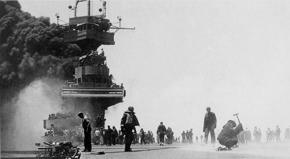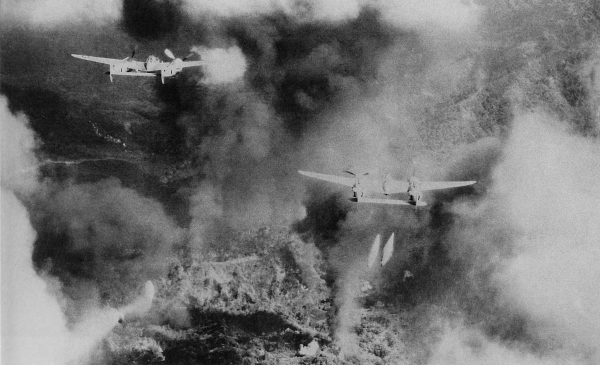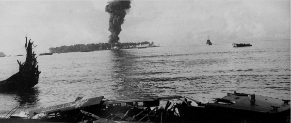 FLYING FORTRESSES, Boeing B 17C heavy bombers, burning at Hickam Field, Oahu, on 7 December 1941 (top); wreckage at the Naval Air Station at Pearl Harbor, after the enemy attack, 7 December (bottom). At 0730 on 7 December the first waves of Japanese aircraft struck the U.S. defenses. Although a few U.S. fighter planes managed to get into the air and destroyed some of the Japanese planes, the attack wrought severe damage. After neutralizing the airfields the Japanese struck at the U.S. Navy warships in the harbor.