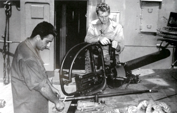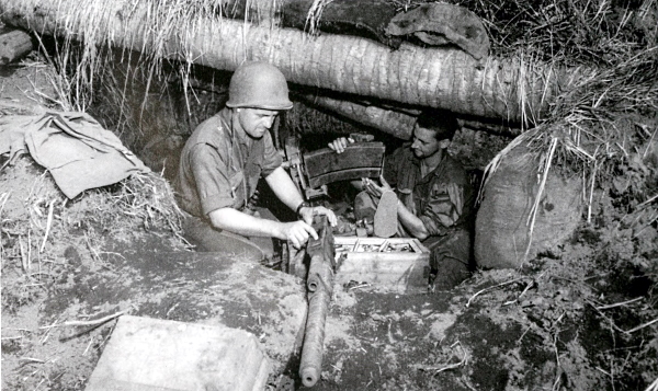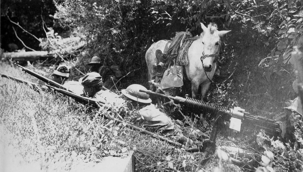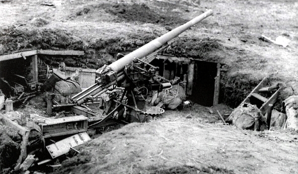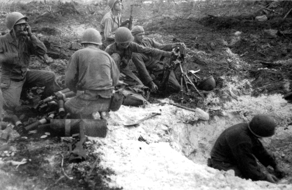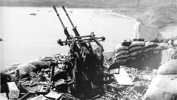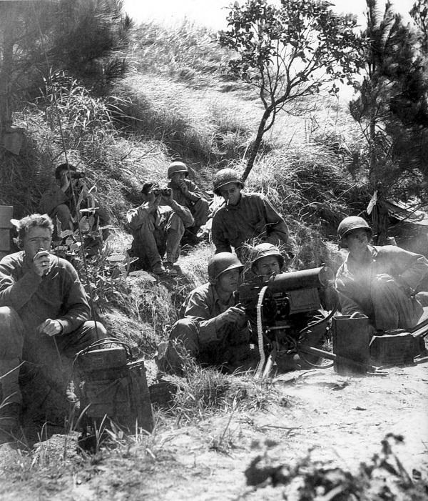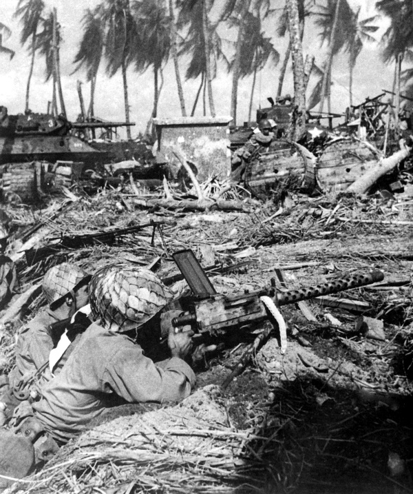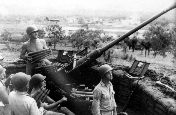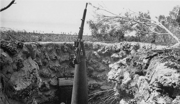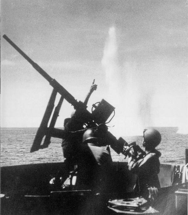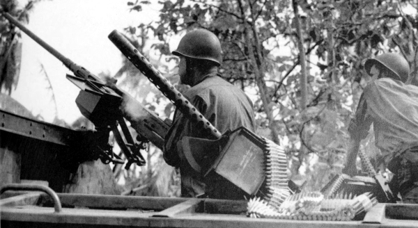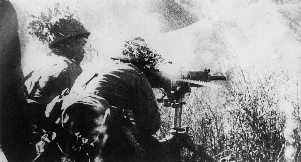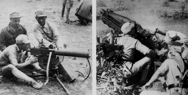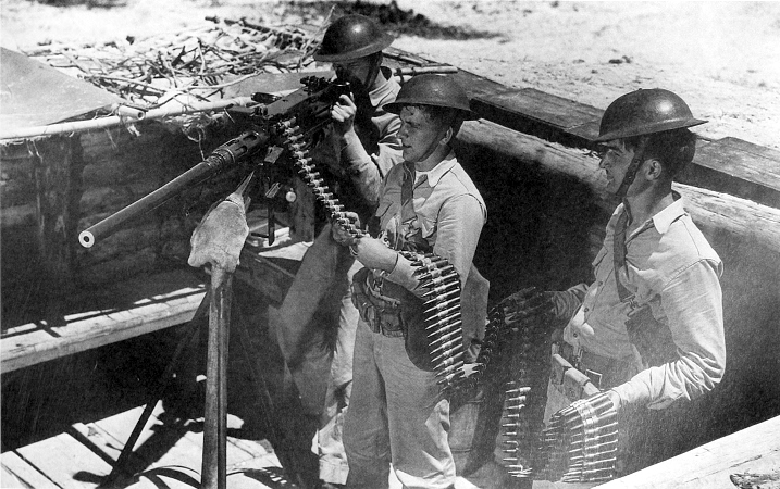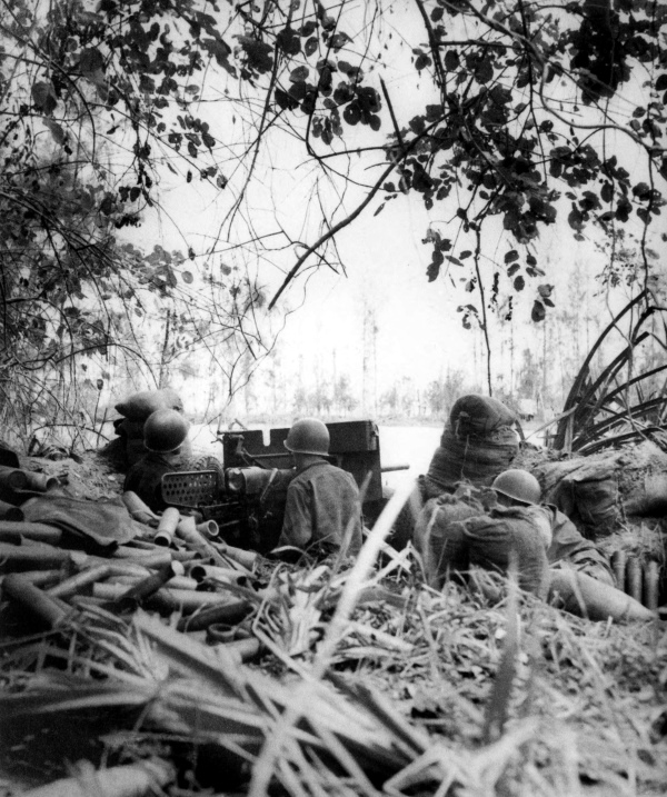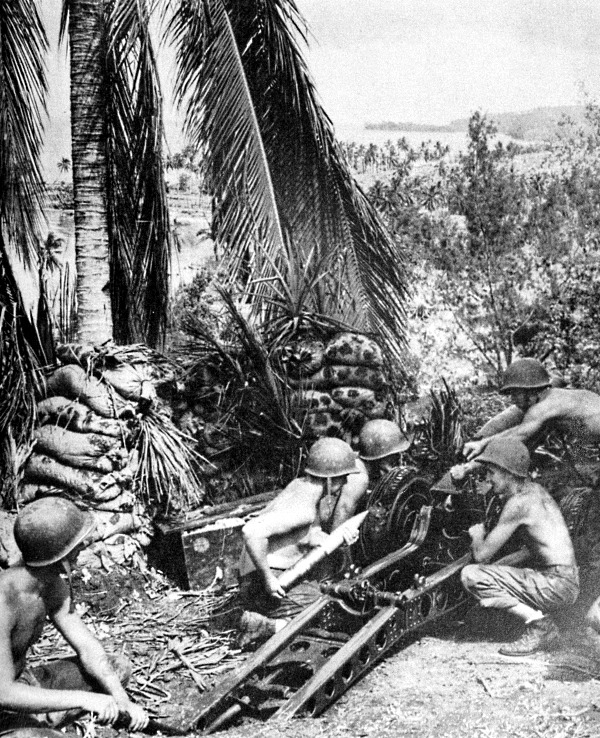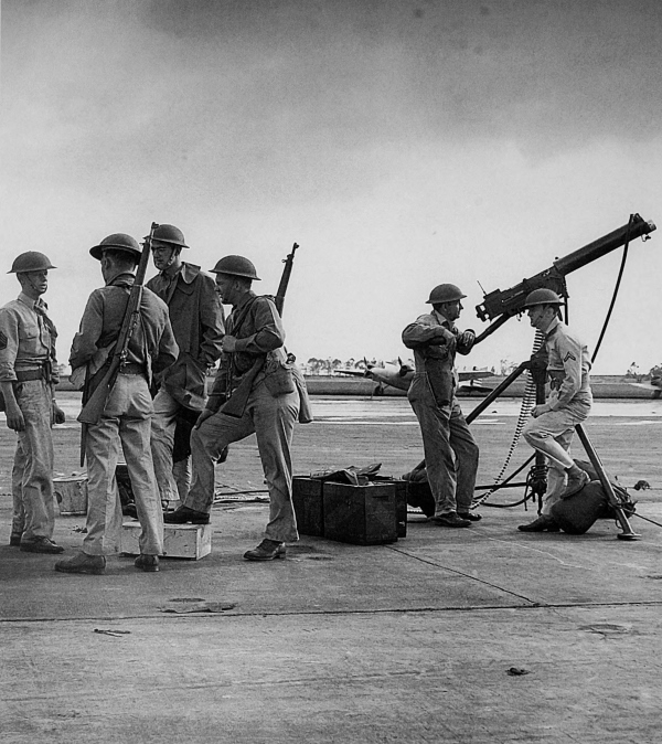 BROWNING ANTIAIRCRAFT MACHINE GUN on a runway at Wheeler Field, Oahu, in the Hawaiian Islands. Early in December 1941 all the U.S. troops, including antiaircraft batteries, were returned to their stations from field maneuvers to await the signal for riot duty. Trouble was expected, and while Japanese diplomats in Washington talked peace, their Pearl Harbor Striking Force was moving eastward toward Hawaii. During this movement the fleet maintained radio silence and was not detected as it approached the islands. (.50-caliber antiaircraft machine gun, water-cooled, flexible.)