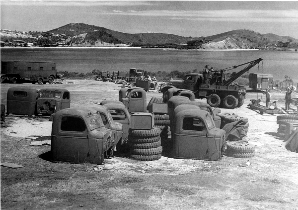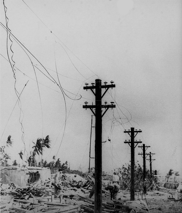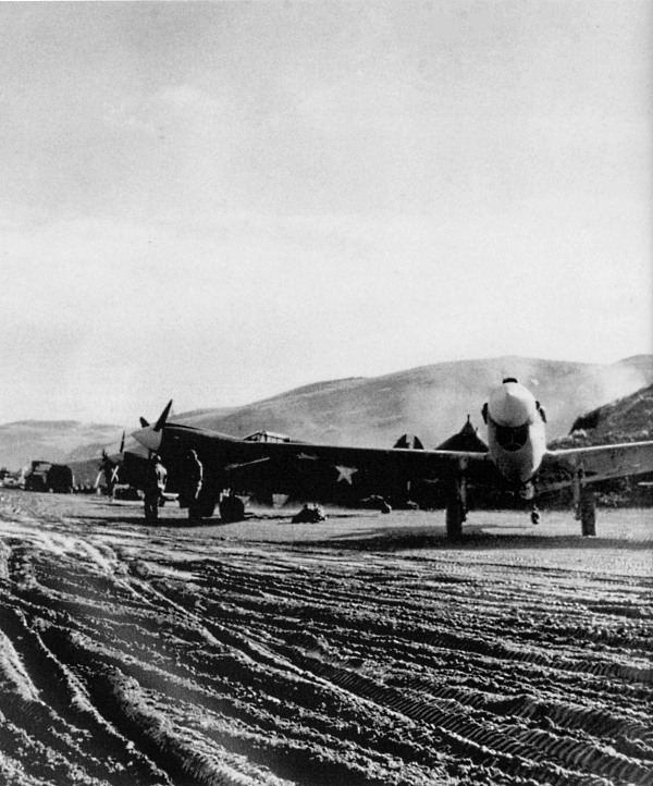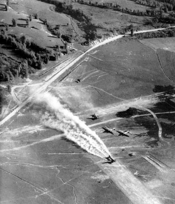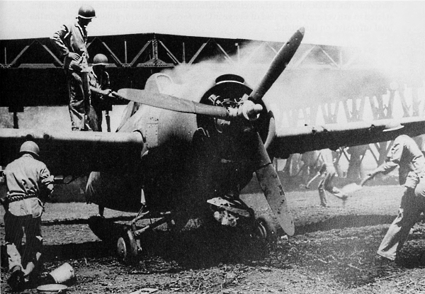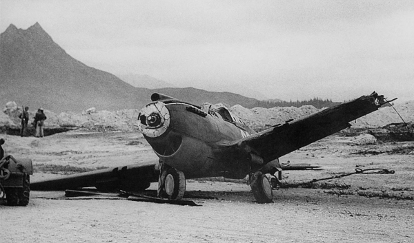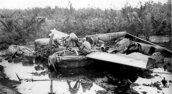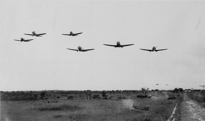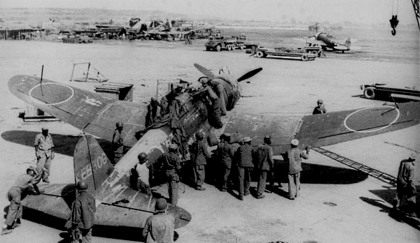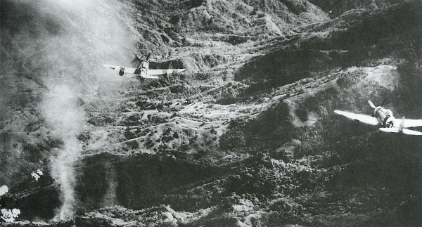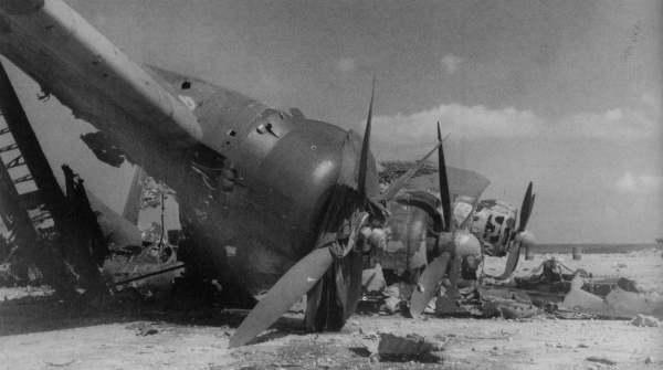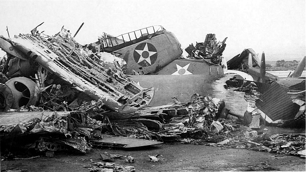 DESTROYED CURTIS P 40 FIGHTER PLANE at Bellows Field (top); wrecked planes at Wheeler Field after the 7 December attack (bottom). Of the Army’s 123 first-line planes in Hawaii, 63 survived the attack; of the Navy’s 148 serviceable combat aircraft, 36 remained. Only one small airfield on the north shore near Haleiwa was overlooked during the raid.