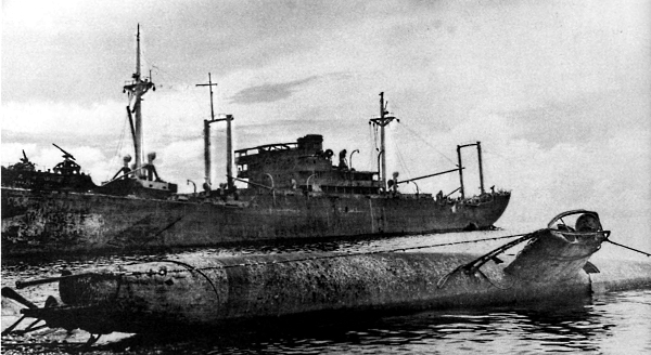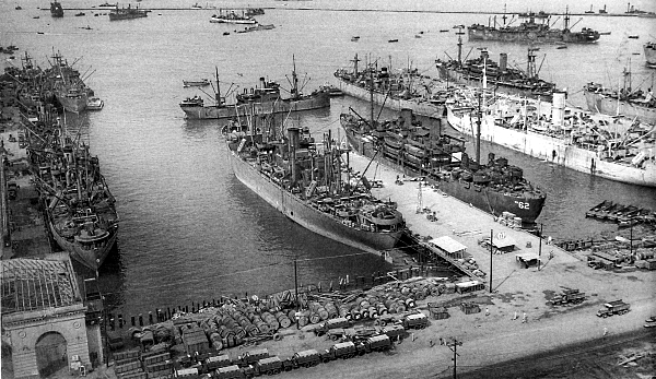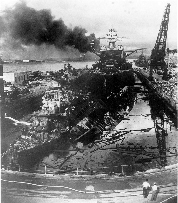 DAMAGED WARSHIPS. The U.S. destroyers Dowries, left, and Cassin, right, and the battleship Pennsylvania, in background, shortly after the attack on Pearl Harbor. Of the eight battleships hit, the Arizona was a total loss; the Oklahoma was never repaired; the California, Nevada, West Virginia, Pennsylvania, Maryland, and Tennessee were repaired and returned to service. The slight depth of Pearl Harbor made possible the raising and refitting of these ships.