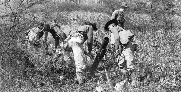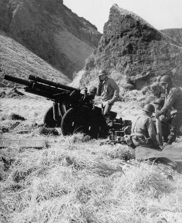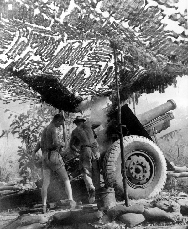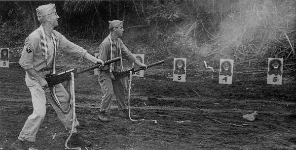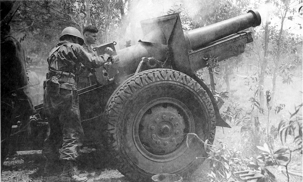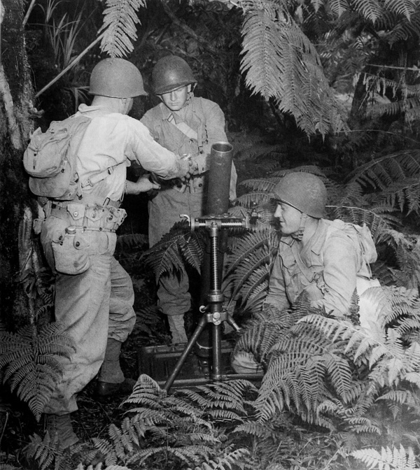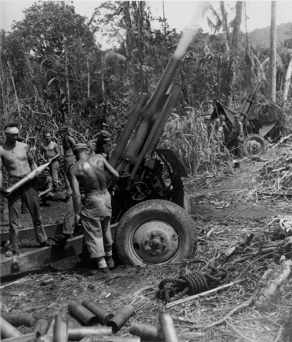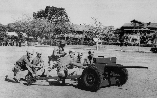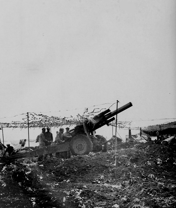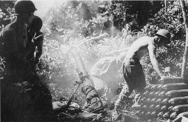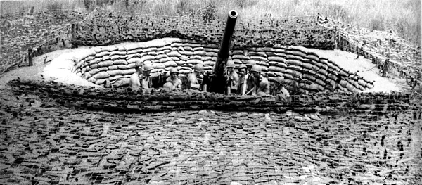 4.2-INCH CHEMICAL MORTAR CREW in action during maneuvers (top); 75-mm. gun M1917A1 in a camouflaged position (bottom). As in all U.S. military commands, the Hawaiian Department was faced with the problem of training the largely inexperienced forces available at the time.