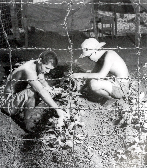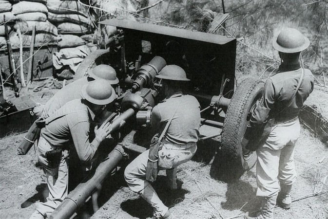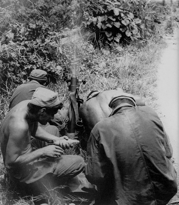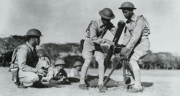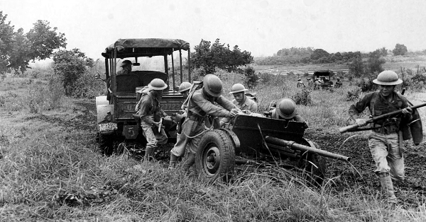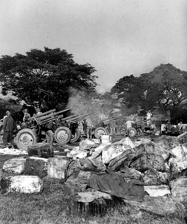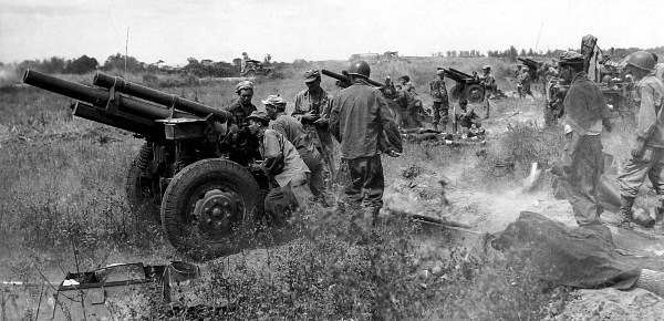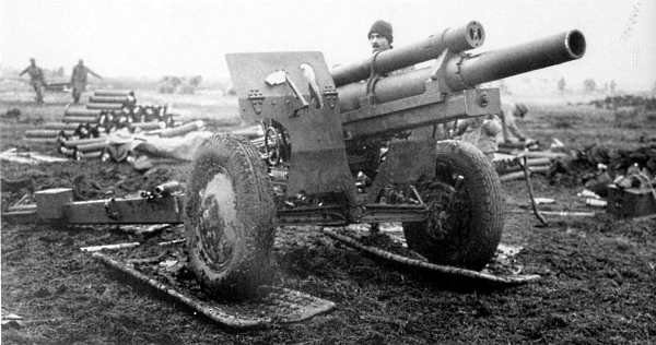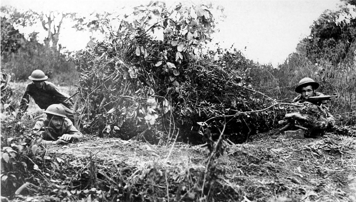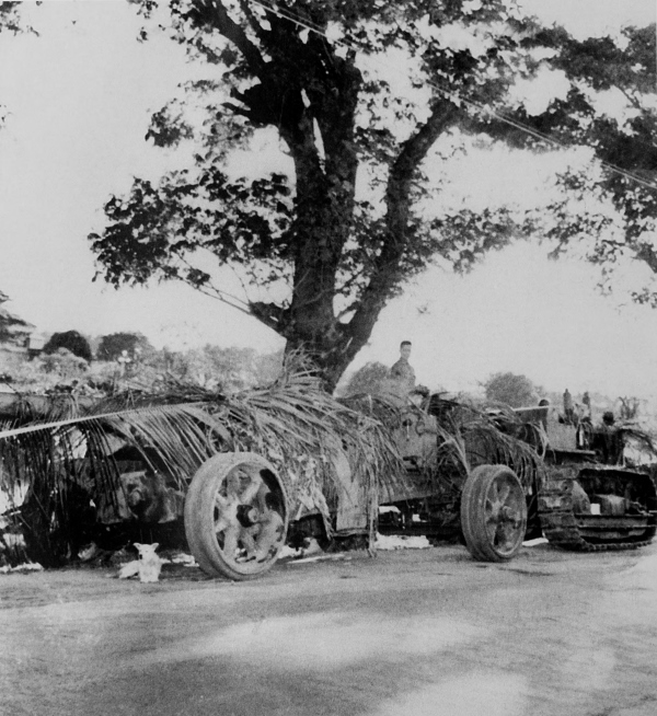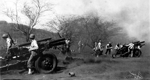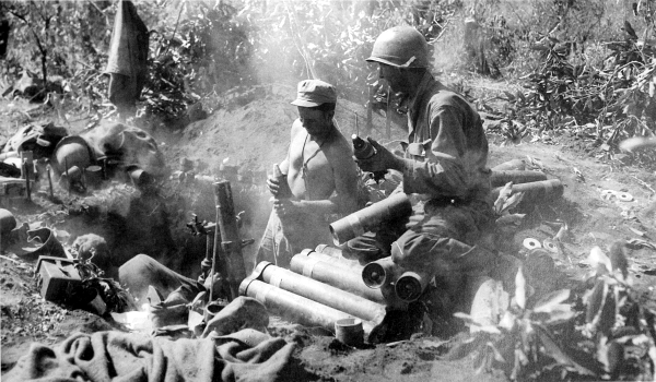 4.2-INCH CHEMICAL MORTAR CREW in action during maneuvers (top); 75-mm. gun M1917A1 in a camouflaged position (bottom). As in all U.S. military commands, the Hawaiian Department was faced with the problem of training the largely inexperienced forces available at the time.