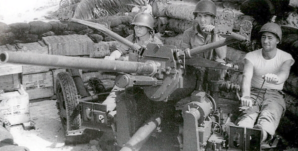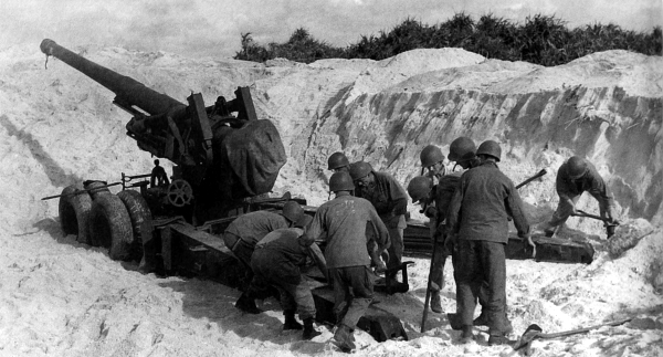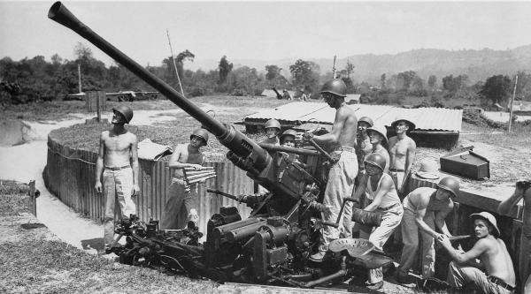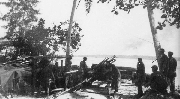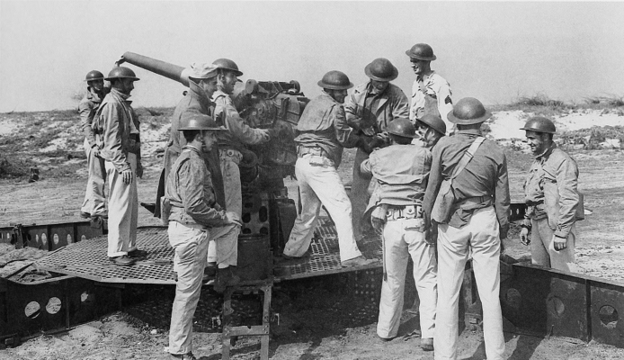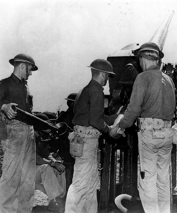 COAST ARTILLERY BATTERY training in Hawaii. Man at left is placing a round in the manual fuze setter of a 3-inch antiaircraft gun M1917M2. A plan for the defense of the Hawaiian Islands had been set up and joint maneuvers (land, air, and naval forces) were held periodically to test the various security measures.