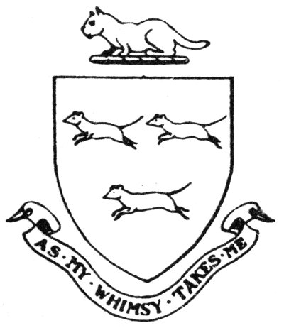 Arms: Sable, 3 mice courant, argent; crest, a domestic cat crouched as to spring, proper; motto: As my Whimsy takes me.