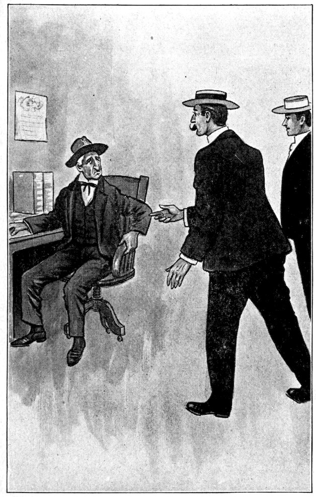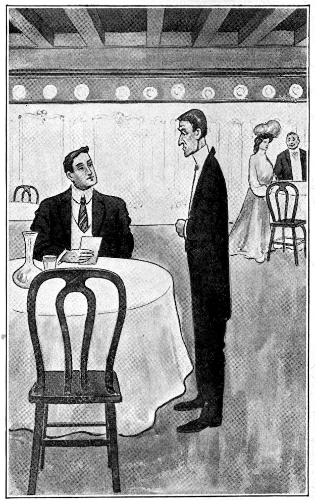 31With this explanation Mr. Nig slid out of the way. The next time I came in the dining-room I was fitted out with an umbrella handle. It was one of the largest ones I ever saw and shaped not unlike a revolver handle. This I had in my hip pocket. I threw my coat tails to one side and exposed for a moment the top of the handle to the gaze of the head waiter. After I was sure he had seen it I walked up to him and said: