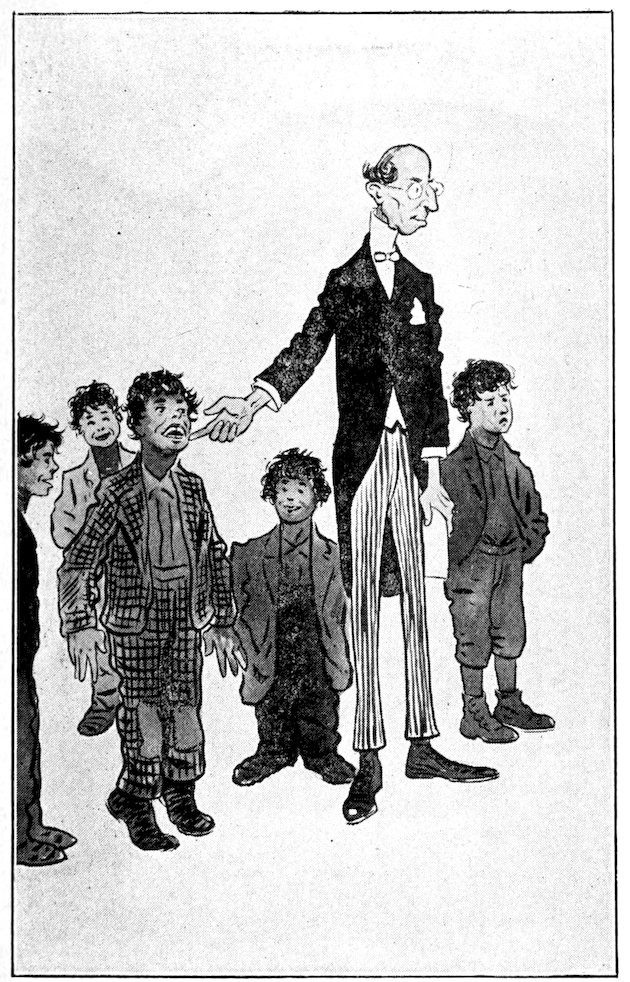 He opened a little door in the wall and the kids fell over themselves into the next room. Then the door was shut, but I couldn’t have heard what was doing in the next room, anyway, for the way those little dagos were 125howling would have made a room full of maniacs seem like a summer breeze. Just to remind them that I was there I picked up two of them and cracked their heads together. That seemed to interest them a little, and the other boys stopped to take rubbers at the fun. I couldn’t see as I was hurting them any, so I went on batting them. The rest of the crowd evidently got a hunch as to what might be coming to them, for they all filed over to a row of chairs and sat down. It was so still all of a sudden that I could hear their heads crack as I brought them together.