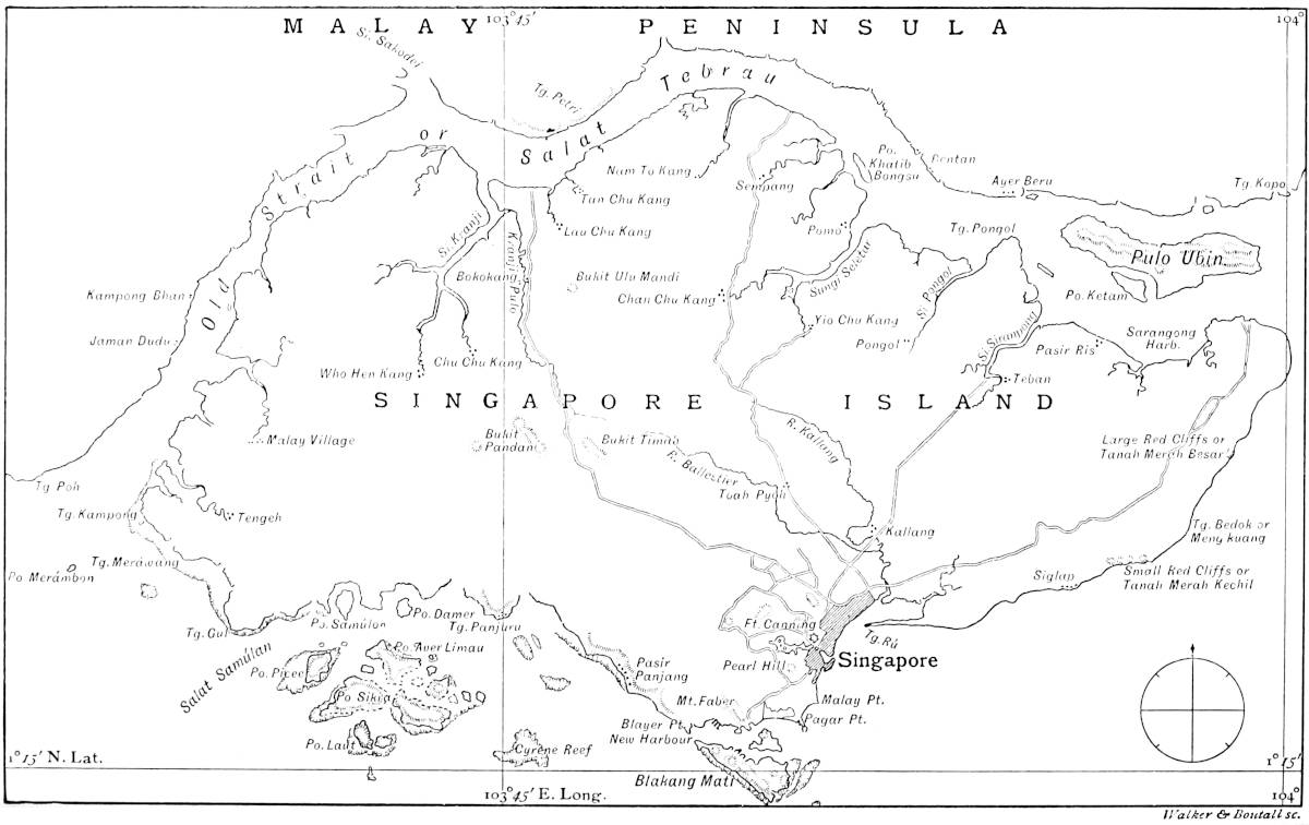 Weighed early for Singapore Roads. Anchored. Found French corvette Sabine and an American frigate St. Louis.