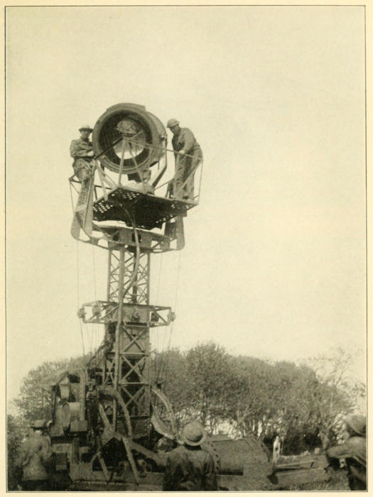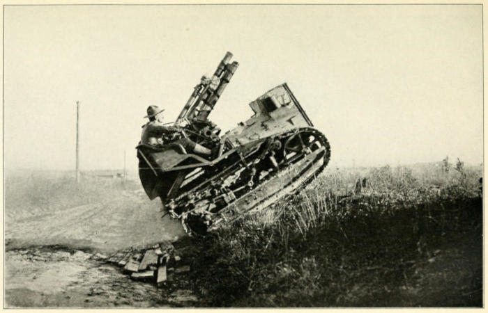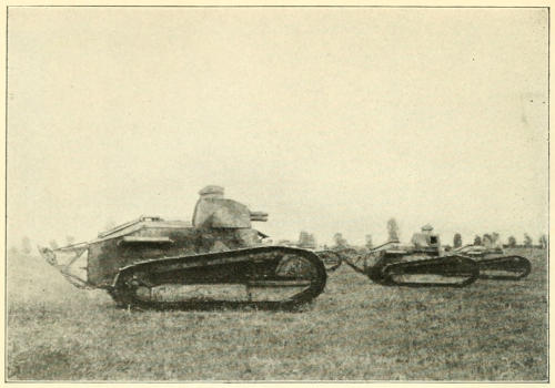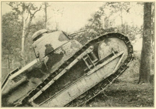 Though I saw one of the tanks in action on this occasion—it was named, if I am not mistaken, “Crème de Menthe”—I was not permitted to photograph it or to write about it. It has repeatedly been asserted that these tanks were the first vehicles of their kind in the history of warfare, and that is true, so far as the method used for their propulsion is concerned, yet it is interesting to note that, ten years before the Great Navigator set foot on the beach of San Salvador, Leonardo da Vinci had written as follows to the Duke Ludovico Sforza: “I am also building secure and covered chariots which are invulnerable, and when they advance with their guns into the midst of the foe, even the largest army masses must retreat, and behind them infantry may follow in safety and without opposition.”