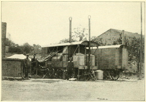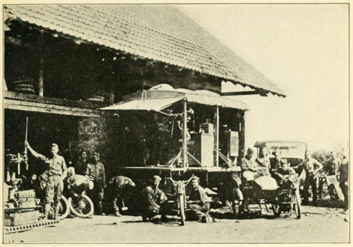 MOBILE MACHINE-SHOP OPERATING IN A VILLAGE UNDER SHELL FIRE.