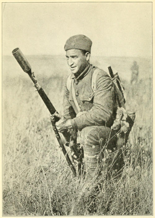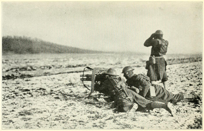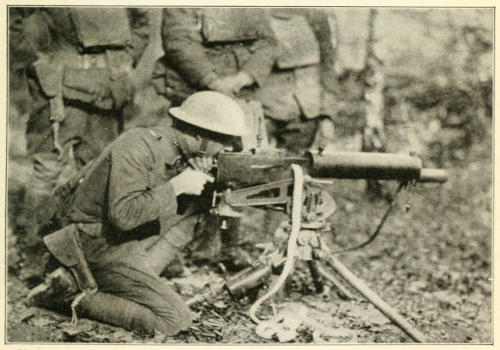 The Germans were more successful, however, when it came to devising protective measures against tank attacks. These consisted of trenches of peculiar construction and design, some of them from 15 to 20 feet wide and 6 to 8 feet in depth; “tank traps,” consisting of deep pits with camouflaged covers; bridges so built as not to support a tank’s weight; mine-fields; special tank observation-posts; Tank Goschutz Batterie, as the Germans called their groups of 77-mm. antitank cannon; 55-mm. tank batteries, which were kept in pits about a thousand metres from the front line and [415]were only brought up when tanks were signalled; trench mortars mounted for horizontal fire; machine-guns firing armor-piercing bullets; hand-grenades with concentrated charges, and antitank rifles. The antitank rifle was a single-shot Mauser, mounted on a bipod, weighing 32 pounds and firing an armor-piercing ball of 13-mm. caliber. At close range this weapon penetrated the British heavy and the French light tanks. Had it been used in groups it might well have proved extremely formidable, but the unpopularity it enjoyed because of its heavy recoil combined with a well-founded reluctance on the part of its users to await the near approach of a tank, in a large measure neutralized its effectiveness. Toward the close of the struggle it seems to have fallen into general disuse, and when the Armistice was signed the enemy was preparing to supplant it with a 22-mm. machine-gun, a few of which had already been used with considerable success.