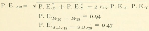 These correlations all being positive and the r’s being very uniform, both correlation of ratios and the partials, makes the interpretation of specialized inheritance of ability extremely unlikely. The correlation of Arithmetic Ratios with Reading [57]Ratios is higher in 1920 than that of Vocabulary Ratios with Reading Ratios. It leaves the possibility that the unremoved factors are inherited ethical differences or that they are a “general educational factor.” The negative correlation of AccR with intelligence, however, being as high as these positive remnants of interrelation, would tend to make more probable an interpretation of this as a remnant of disparity, intelligence accounted for, which is entirely due to the organization of our schools.
