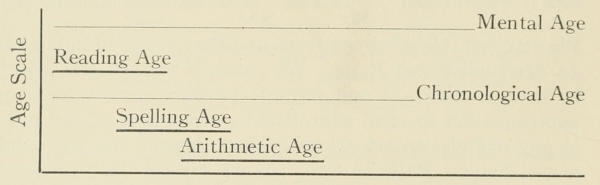 Here it can be easily shown that Spelling Age, Reading Age, Arithmetic Age, etc., are in some definite relation to both Chronological Age and Mental Age. Using the Mental Age line as a goal, these records may be kept constantly up to date. Another use of the Accomplishment Ratio is as the medium in which the children may keep records of their own work. As it is a mark in terms of intelligence, dull and brilliant children may compete on a parity to bring their Accomplishment Ratios as high as possible.
