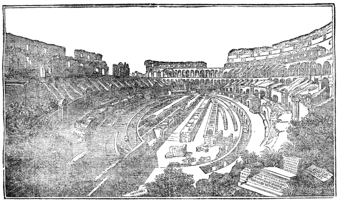 The Colosseum, which is of an oval form, occupies the space of nearly six acres. “It may justly be said to have been the most imposing building, from its apparent magnitude, in the world; the pyramids of Egypt can only be compared with it in the extent of their plan, as they cover nearly the same surface[2].” The greatest length, or major axis, is 620 feet; the greatest breadth, or minor axis, 513 feet. The outer wall is 157 feet high in its whole extent. The exterior wall is divided into four stories, each ornamented with one of the orders of architecture. The cornice of the upper story is perforated for the purpose of inserting wooden masts, which passed also through the architrave and frieze, and descended to a row of corbels immediately above the upper range of windows, on which are holes to receive the masts. These masts were for the purpose of attaching cords to, for sustaining the awning which defended the spectators from the sun or rain. Two corridors ran all round the building, leading to staircases which ascended to the several stories; and the seats which descended towards the arena, supported throughout upon eighty arches, occupied so much of the space that the clear opening of the present inner wall next the arena is only 287 feet by 180 feet. Immediately above and around the arena was the podium, elevated about twelve or fifteen feet, on which were seated the emperor, senators, ambassadors of foreign nations, and other distinguished personages in that city of distinctions. From the podium to the top of the second story were seats of marble for the equestrian order; above the second story the seats appear to have been constructed of wood. In these various seats eighty thousand spectators might be arranged according to their respective ranks; and indeed it appears from inscriptions, as well as from expressions in Roman writers, that many of the places in this immense theatre were assigned to particular 146individuals, and that each might find his seat without confusion. The ground was excavated over the surface of the arena in 1813; a great number of substructions were then discovered, which by some antiquaries are considered to be of modern date, and by others to have formed dens for the various beasts that were exhibited. The descriptions which have been left by historians and other writers of the variety and extent of the shows, would indicate that a vast space and ample conveniences were required beneath the stage, to accomplish the wonders which were, doubtless, there realized in the presence of assembled Rome. We subjoin, from Messrs. Cresy and Taylor’s work, an interior view looking west, taken at the time when the arena was so excavated. It has since been filled up. The external view of this remarkable building is given as it existed in the time of Piranesi, in the last century.