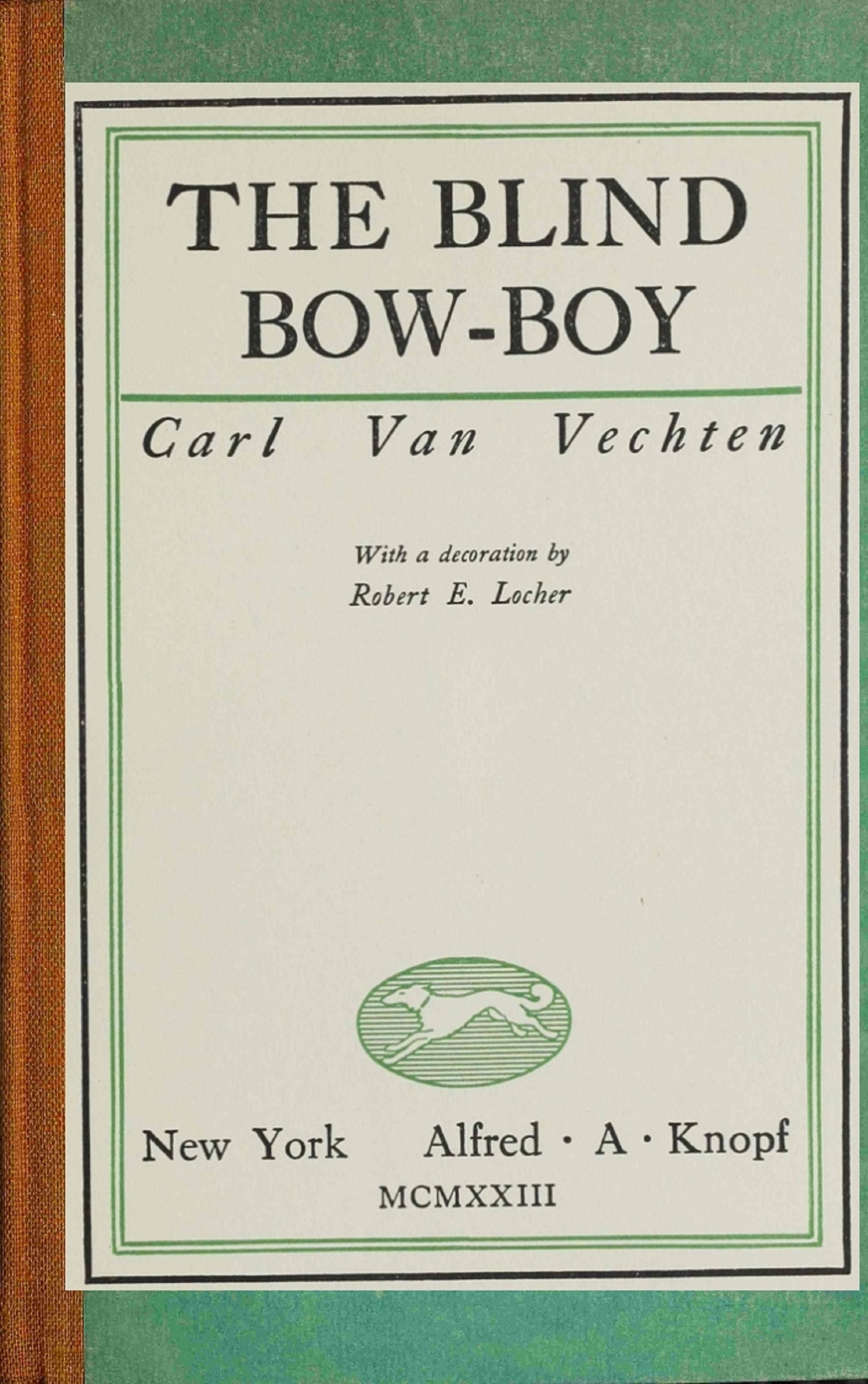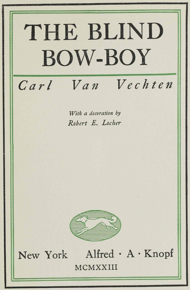 The first edition of THE BLIND BOW-BOY consists of thirty-six hundred and fifteen copies as follows: fifteen on Borzoi all rag paper signed by the author and numbered A to O; one hundred copies on Borzoi all rag paper signed by the author and numbered 1 to 100; and thirty-five hundred copies on English featherweight paper.