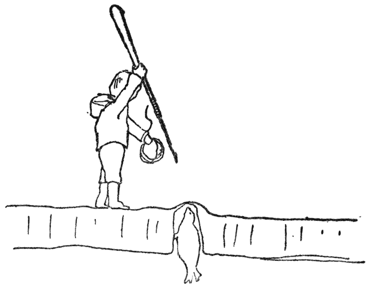 Timbury en die ander twee konstabels, Murray en Dunn, het daardie agtermiddag met ons uitgegaan om sneeuhase te skiet. Ons het een gesien, maar kon nie naby genoeg kom nie, want een van die honde het ons gevolg en elke slag die haas geja net as ons hom in die oog kry. Ed het op ’n klein meer omtrent twee myl van die dorpie ’n eend geskiet en ek twee. Ons het nie geweet hoe ons moet maak om hulle te kry nie. Eindelik het Ed sy klere uitgetrek [154]en tot onder sy arms die yskoue water ingegaan en hulle gehaal.