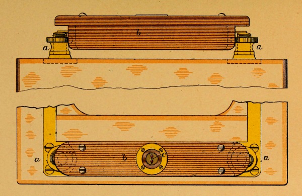 In the center of each cover, around the hole for the entrance of the leading-wires, is a brass rim fitted with a screw-thread outside, and bored out, inside, with a slightly conical taper, providing a seat for the packing.